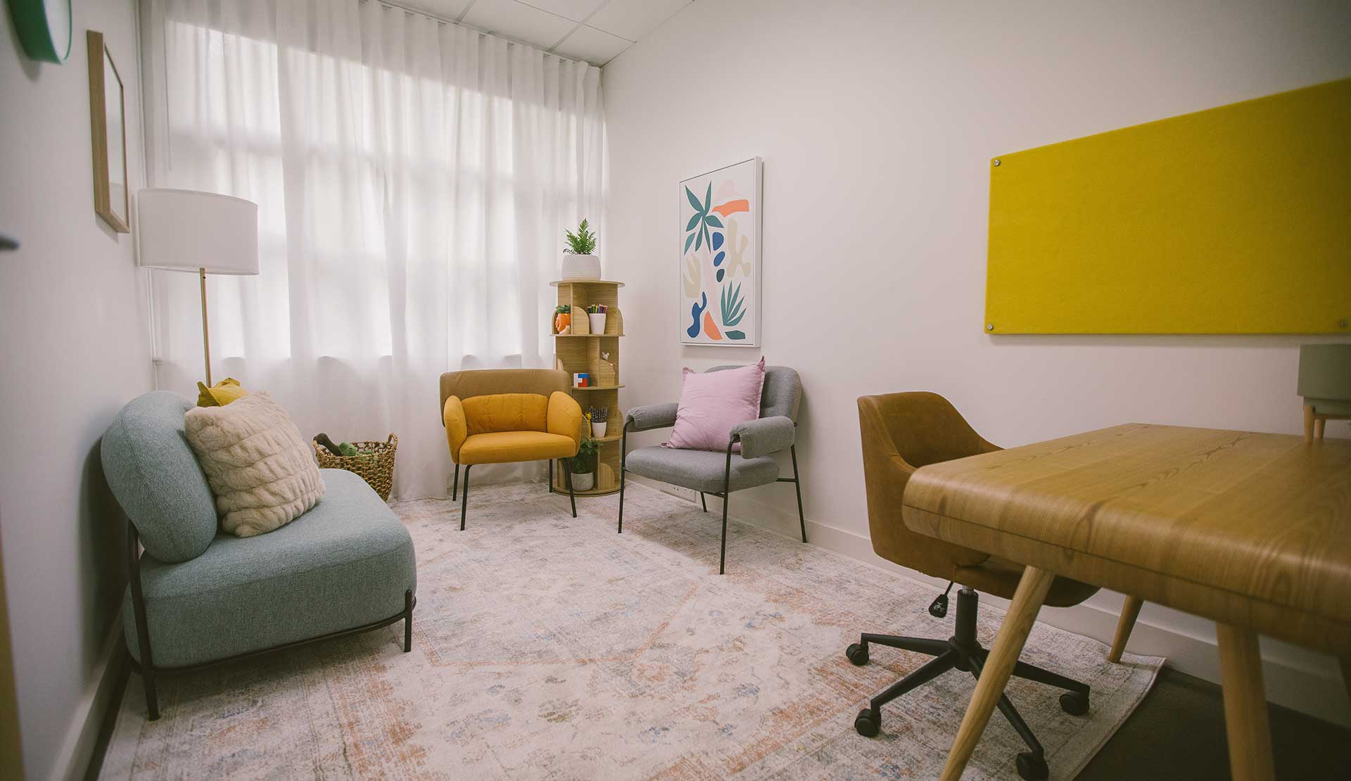 Light-filled, beautifully appointment therapy rooms. We also have a large room which can be used for running groups, team meetings, and peer supervision.